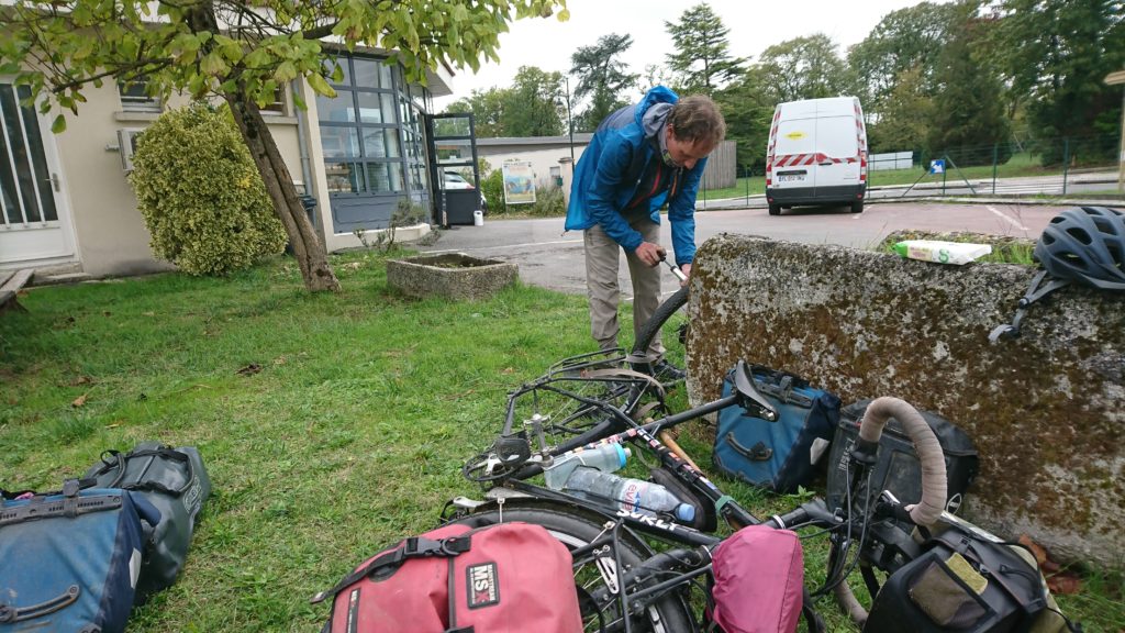 6 crevaisons en 3 jours : un record ! Après bordeaux, à la 3ème crevaison, on a le droit à un changement de chambre à air avec réparation rustine, notre stock de sécu étant épuisé ! Le tout dans le froid et sous la pluie.. Nous nous en souviendrons !